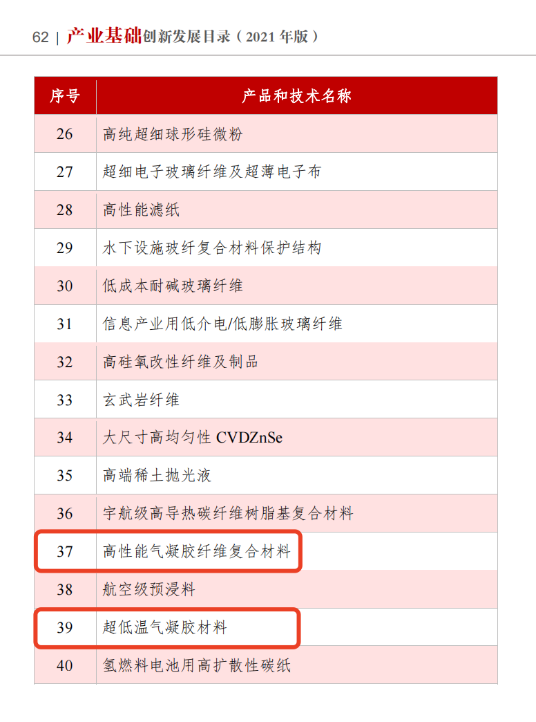 2022年7月26日,由中国工程院、国家制造强国建设战略咨询委员会指导,国家产业基础专家委员会编制的《产业基础创新发展目录(2021年版)》(以下简称《目录》),在浙江省宁波市“2022国家制造强国建设专家论坛”上发布。其中,《目录》建材领域基础材料包含高性能气凝胶纤维复合材料和超低温气凝胶材料。